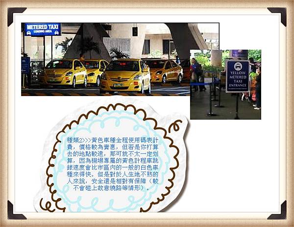 ※ 最快的轉換航廈的辦法為海關出境後,直接離開大堂走出航廈,你就可以留意得到搭乘計程車的區域。寫到此要提醒注意的是,當你走出了出境大廳,通常都會有人上前來詢問是否需要搭車,可千萬別馬上爽快答應喔。有抽菸的朋友,此時可先停留鬆口氣,順便好好觀察方向 (  ̄ c ̄)y▂ξ。通常這些計程車都是私自進入機場拉客,安全上需留心。機場區域內正式授權的計程車有兩種,招呼站明顯可見,也會設排隊路線較有系統。