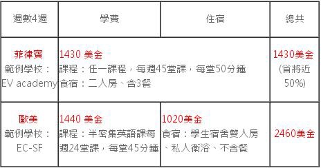 菲律賓的消費水平較低,每月的平均花費約為歐美地區的1/4。對想壓縮學習時間、預算有限的小資族,不用擔心會因為一趟遊學而荷包大失血。以4週為例,做菲律賓與歐美學校比較,即可發現菲律賓遊學的確CP值超高!