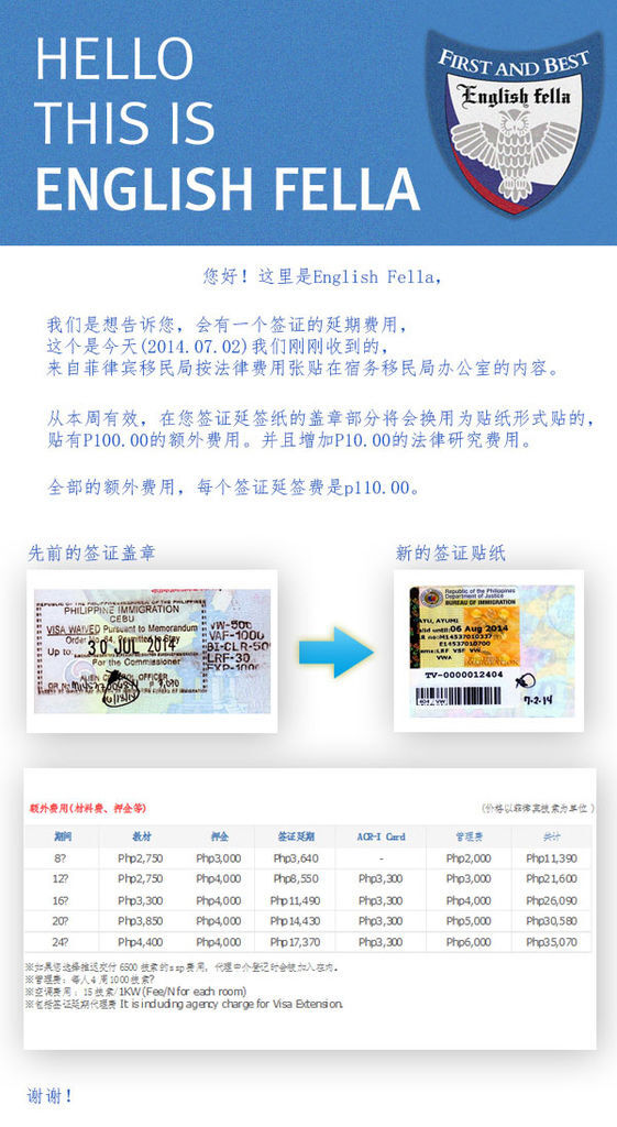近日菲律賓官方修改了辦理延簽的收費標準,欲前往遊讀的同學們請留意,各校實際收費情形請再參照各校頒發之說明。
