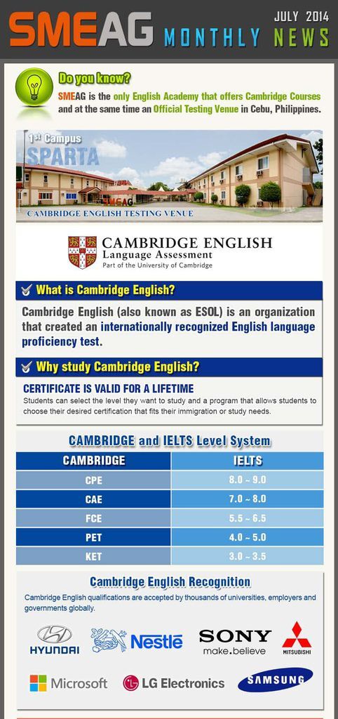 SMEAG在斯巴達校區設置了劍橋英語培訓課程,是宿霧唯一一家專業培訓劍橋英語考試的學校,位置臨近菲律賓宿霧的的ESOL官方考場CIE
