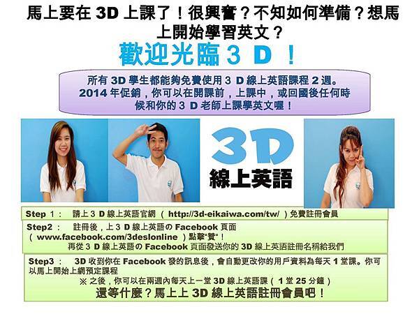 2. 3D Free Online Class - As some of you have noticed, 3D is now giving 2 weeks free online English class to all Taiwanese students upon signing up: